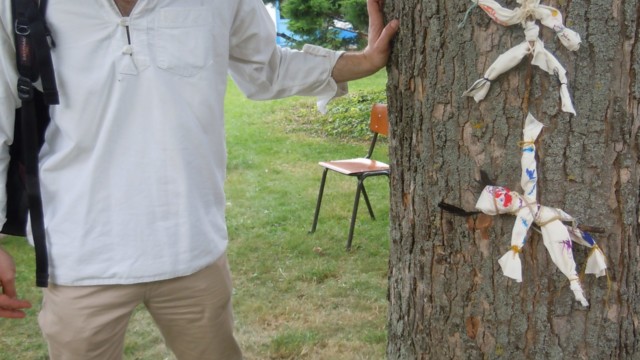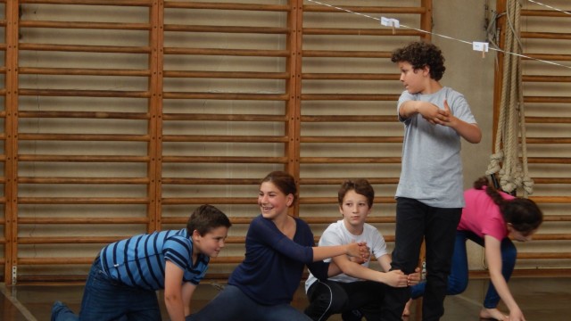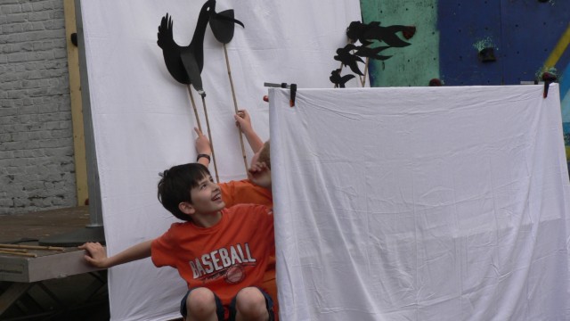 Daarnaast werken we dus in een ruimte die we een beetje als onze vertrekbasis zouden kunnen beschouwen. Hier doen we zeer diverse activiteiten. Zo zullen we aan het begin van elke voor- en namiddag een opwarming doen. Die omhelst namenspelletjes, spelletjes gericht op concentratie, verbeelding, groepsvorming, speldurf en -bereidheid en allerlei kunstvormen. Ook zijn er specifieke opdrachten binnen het artistieke domein waarin we dat blok willen werken. Daarnaast zijn er een aantal beeld- en knutselopdrachten waaruit we kunnen kiezen. We denken onder meer aan ateliers in klei, maskers en kostuums.