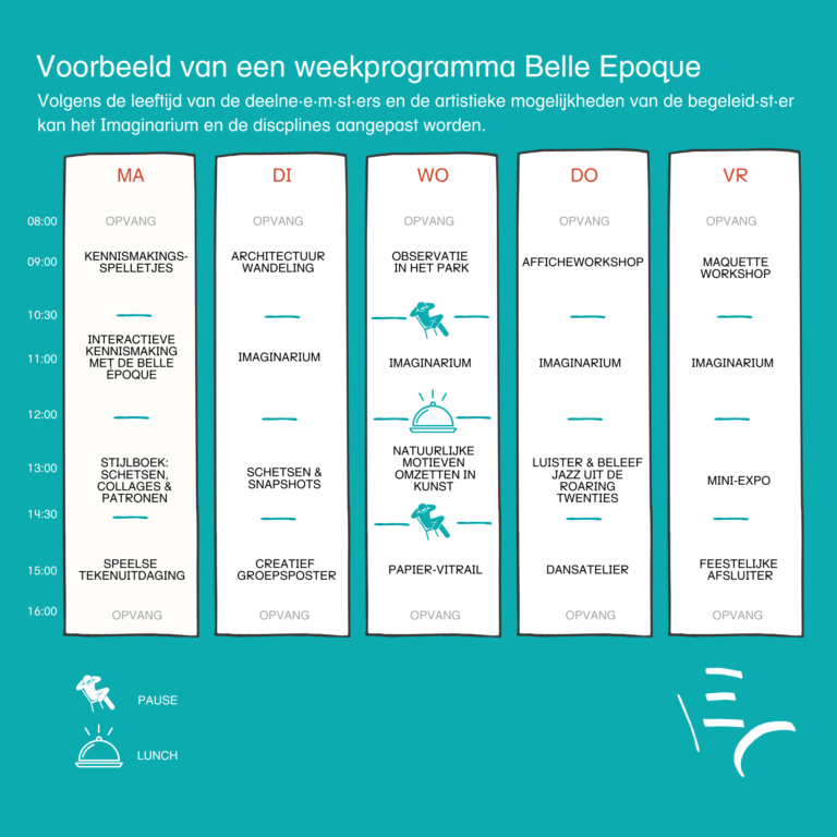 We duiken in een week waarin elke dag een artistiek, speels en filosofisch avontuur wordt, geïnspireerd door de creatieve en innovatieve geest van de Belle Époque. We laten ons inspireren door de vloeiende lijnen, organische vormen en geometrische patronen van die tijd.