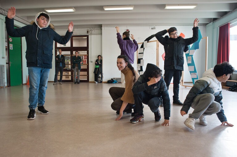 Na het middageten gaan we dat aspect verder uitdiepen. Dan vinden we overal inspiratie en gaan we aan personages werken, situaties verzinnen en verhalen maken. Geleidelijk (en meestal ongemerkt) wordt ons speelveld een podium. We doen korte improvisaties en werken aan scenes.