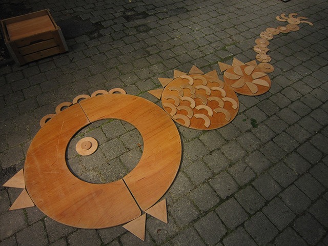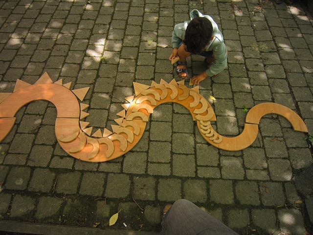 Le sol devient la toile où naissent des histoires. En déplaçant, combinant et empilant les formes, de nouvelles perspectives apparaissent sans cesse : monstres mystérieux, tournesols faits de triangles, jardins de palais en carrés…